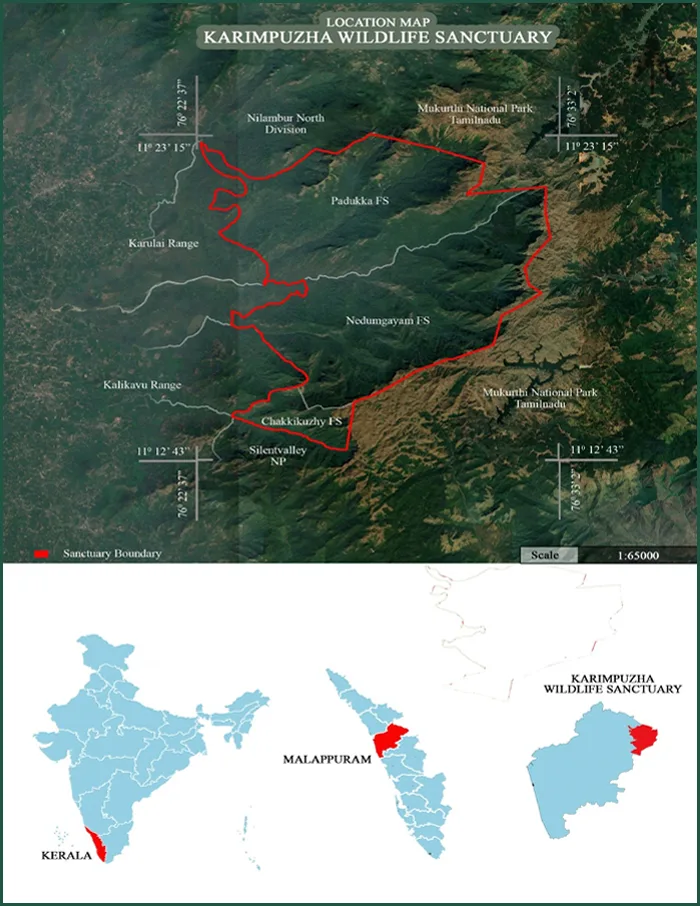 Karimpuzha WLS is located on the western slopes of Nilgiris, lies between the geographical limits of N 11o23’15’’to 11o12’43’’ latitudes and E 76o22’37’’ to 76o33’2’’ longitudes and falls in the Nilambur Taluk of Malappuram Revenue District in Kerala. Karimpuzha WLS area forms part of the revenue villages of Karulai, Moothedam and Amarambalam. The sharp topographical gradient of the hills ranging from 40m to 2550m is the primary reason for the unique biodiversity of the Karimpuzha WLS.